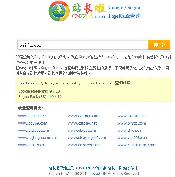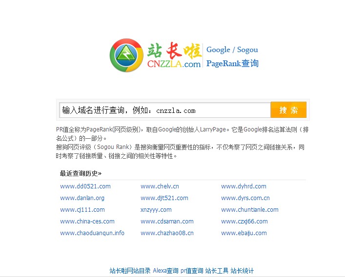 站长啦PR查询/SR查询工具是目前网络上唯一支持同时查询谷歌PR和搜狗SR的源代码,现在网上流传的搜狗SR查询的几乎都失效的,欢迎站长们使用!并且雨过天晴工作室(www.42824.com)提供技术支持,维持更新!